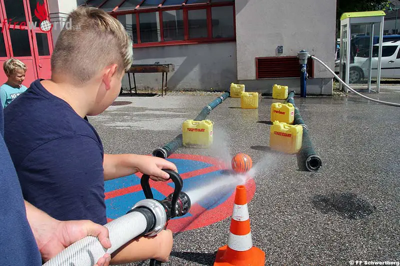 Als dritte Station galt es einen Ball mittels Wasserstrahl durch einen Parcour zu lenken. Dabei sorgte der ein oder andere Wasserstahl für etwas Abkühlung. Zum Abschluss wurde Schwertberg noch mit den Feuerwehrfahrzeugen erkundet und anschließend der spannende Nachmittag gemütlich bei einer kleinen Grillerei beendet.