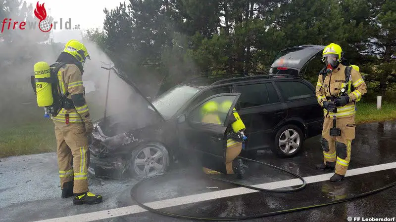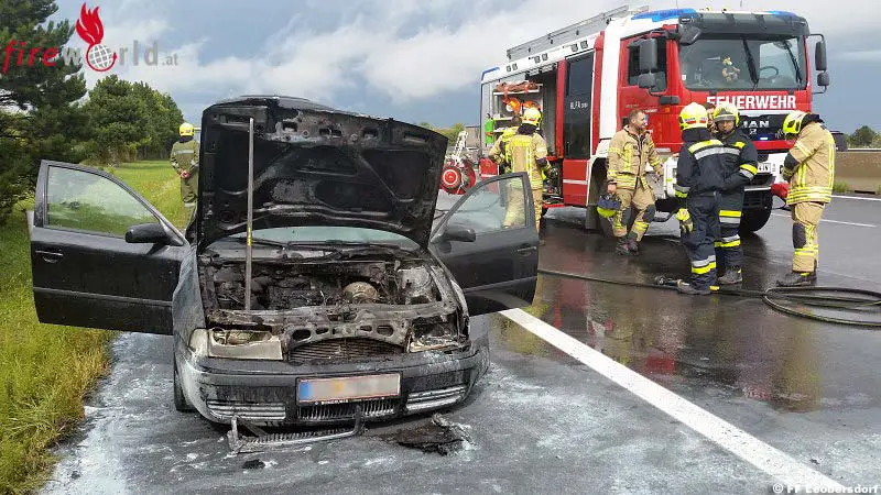LEOBERSDORF (NÖ): Am 1. September 2017 wurde die Feuerwehr Leobersdorf um 14.05 Uhr zu einem Pkw-Brand auf die A2 Richtung Graz alarmiert. Mehrere Anrufer meldeten ein brennendes Fahrzeug nach der Raststation Triestingtal bei der Feuerwehr Bezirksalarmzentrale.