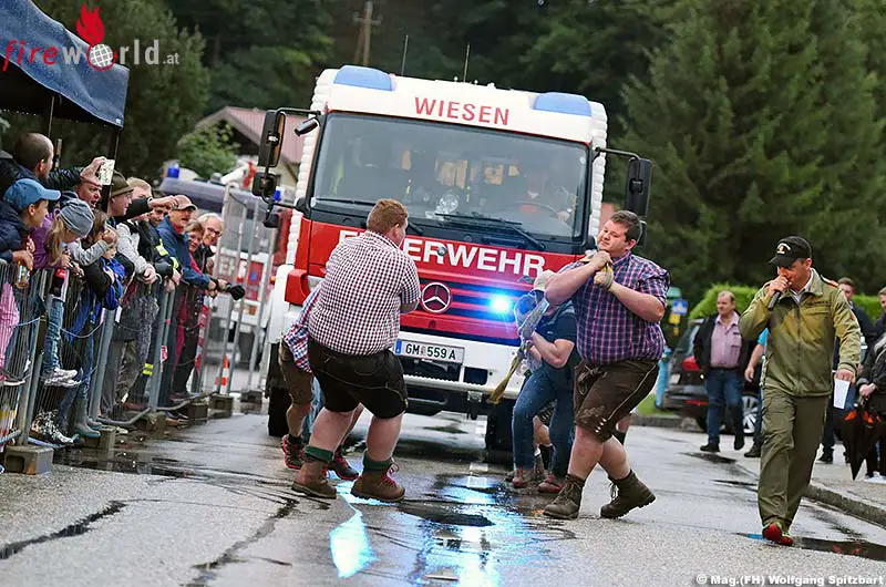 PINSDORF (OÖ): Die Feuerwehrmitglieder sind nicht nur im Einsatz starke Männer (und Frauen), sondern auch in ihrer Freizeit. Die Feuerwehr Wiesen (Gem. Pinsdorf, Bez. Gmunden) organisierte am 1. September 2017 bei ihrem Fest das erste TLF-Pulling.