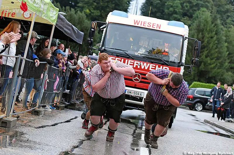 Dabei mussten sechs Männer (oder Frauen) das 13 Tonnen schwere Tanklöschfahrzeig aus dem Stand mit reiner Muskelkraft in weniger als zwei Minuten 30 Meter weit ziehen. Gewonnen haben den ungewöhnlichen Wettbewerb die kräftigen Burschen der FF Aurachkirchen mit einer Sensationszeit von unter 24 Sekunden. 25 Mannschaften von Feuerwehren und Highlander-Gruppen haben beim ersten Mal mitgemacht.