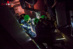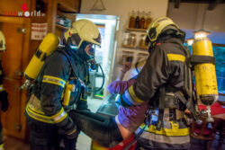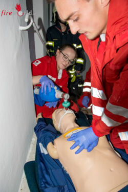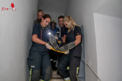 Im Turm hingegen waren die Rettungsarbeiten noch voll im Gange. Unterstützt von zwei Feuerwehrmitgliedern, gelang es den Rettungssanitätern die Person nach rund 20 Minuten erfolgreich wiederzubeleben. Für den Abtransport wurde die Puppe nun durch einen echten Menschen ersetzt. Dieser wurde mittels Spineboard und zahlreicher Einsatzkräfte die drei Stockwerke nach unten zum Rettungswagen getragen. Trotz sehr engen Platzverhältnissen im Stiegenhaus und beginnender Dämmerung konnten die Bad Vöslauer Einsatzkräfte auch diese Aufgabe mit Bravour gemeinsam bewältigen.