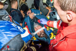 Nun erreichte auch noch die Meldung, dass am Turm der Jubiläumswarte eine verletzte Person liegen soll, die Feuerwehreinsatzkräfte. Da zu diesem Zeitpunkt nicht sicher war, ob es auch im Turm bereits zu einem Brand gekommen ist, schickte der Einsatzleiter einen Atemschutztrupp zur Erkundung und Menschenrettung in den Turm vor. Die drei Feuerwehrmitglieder fanden zwar keinen Brand, dafür aber einen reglosen Menschen im letzten Halbstock des Stiegenhauses vor. Sofort wurde ein Notfallcheck durchgeführt und mit den Wiederbelebungsmaßnahmen begonnen.