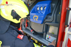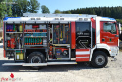 Geräteräume: Das Stichwort Technische Hilfeleistung (Retten u. Bergen) findet man im Geräteraum 1. Im unteren Bereich auf einem Drehfach ist das hydraulische Rettungsgerät SP53 der Marke Weber. Auf diesem Gerät wurden Glasmaster, Heberle u. Gurtenmesser gleich mitverbaut. Dahinter finden sich Rettungszylinder, Schwelleraufsatz, Bereitstellungsplane und das Unterbausystem Marke Stabpack. Markanter Unterschied zu den alten Fahrzeugen ist, dass am Drehfach oben vorne nicht das Schanzwerkzeug verbaut wurde, sondern die Hebekissen. Die Armatur inkl. Druckluftflasche sind in einer tragbaren Box verbaut und ermöglichen dem Feuerwehrmann die Geräte leicht zu entnehmen.