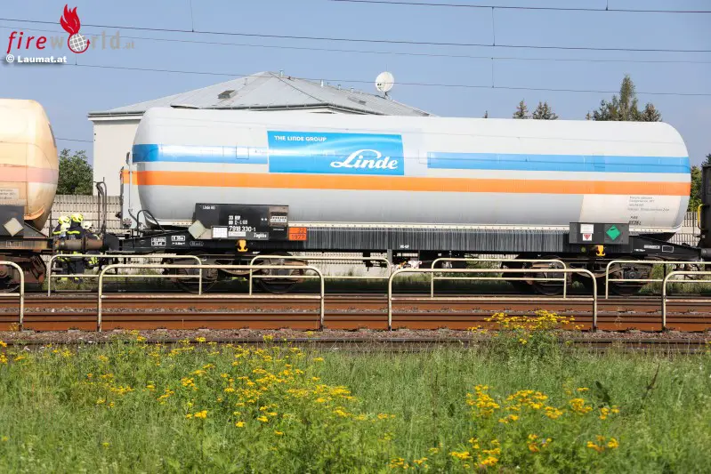 HÖRSCHING (OÖ): Die Feuerwehr stand Dienstagvormittag, 5. September 2017, bei einem Gefahrstoffaustritt aus einem Druckgaskesselwaggon im Bahnhofsbereich Hörsching (Bezirk Linz-Land) im Einsatz.