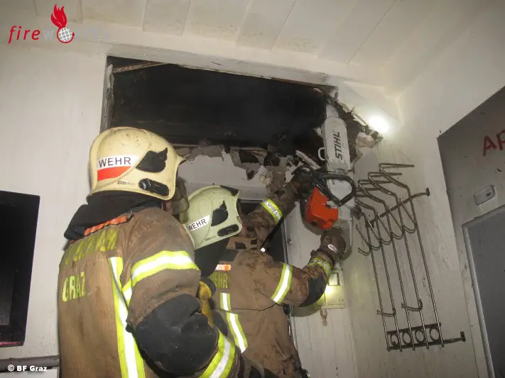 Löschversuche durch einen Angestellten mussten aufgrund der dichten Rauchentwicklung erfolglos abgebrochen werden. Die Grazer Berufsfeuerwehr war binnen weniger Minuten mit 23 Mann und 5 Fahrzeugen am Einsatzort und konnte den Brand in kurzer Zeit mit einem C-Rohr unter schwerem Atemschutz löschen. Da sich in der Zwischendecke bereits Glutnester gebildet hatten, mussten umfangreiche Nachlöscharbeiten durchgeführt und die Zimmerdecke teilweise geöffnet werden. Der Sachschaden wird mit ca. 50.000,- geschätzt!
