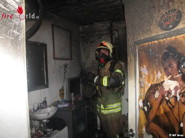 GRAZ (STMK): Zu einem ausgedehnten Zimmerbrand ist es am Montagabend, dem 4. September 2017, in einem Laufhaus in der Waltendorfer Hauptstraße im Graz gekommen. Vermutlich durch eine umgefallene Kerze entzündeten sich leicht brennbare Einrichtungsgegenstände, der Brand griff binnen weniger Minuten auf das gesamte Mobiliar und die Holzverkleidung über.
