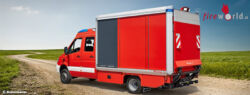 Der Rest der Ladefläche kann je nach Einsatz mit verschiedenen Modulen bzw. Rollcontainern beladen werden – und das bequem und schnell über die integrierte Hebebühne mit einer Hubkraft von einer Tonne. Diese lässt sich entweder per Hand von außen, per Fußbedienung oder über eine Kabelfernbedienung von innen steuern. In den Containern befindet sich die jeweilige Spezialausrüstung, die am Einsatzort benötigt wird. Die Ladefläche bietet genügend Platz, um bis zu drei Container bzw. Paletten zu transportieren. So kann man etwa bei Unwettern mit Starkregen rasch Sandsäcke zum Einsatzort bringen. Aber auch bei Arbeitseinsätzen stellt sich die Ladekapazität als äußerst praktisch heraus. Das gesamte Fahrzeug ist mit umfangreicher LED Beleuchtung versehen, unter anderem verfügt es über eine Nahumfeldbeleuchtung über die gesamte Aufbaulänge, welche auch als Rangierbeleuchtung verwendet werden kann.