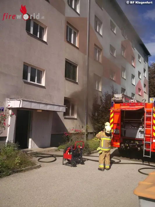 KLAGENFURT (KTN):Zu einem Wohnungsbrand wurden die beiden Klagenfurter Feuerwehr (Berufsfeuerwehr, freiw. Feuerwehr) am Vormittag des 6. September 2017 alarmiert. Bei Ankunft an der Einsatzstelle quollen tiefschwarze Rauchschwaden aus dem gesamten Stiegenhausbereich sowie aus auch der betroffenen Brandwohnung.