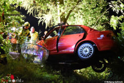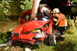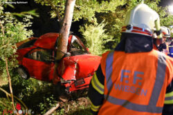PINSDORF (OÖ): Riesiges Glück hatte am Donnerstag Abend, 7. September 2017, ein Autofahrer bei einem Verkehrsunfall in Wiesen (Gem. Pinsdorf, Bez. Gmunden): Sein Fahrzeug kam in einer langgezogenen Rechtskurve links von der Fahrbahn ab, rammte einen Verkehrsspiegel und wickelte sich dann an der Böschung zur Aurach regelrecht um einen Baum.