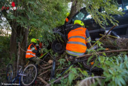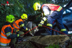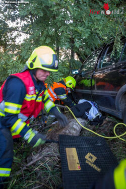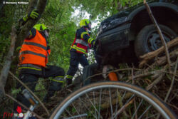 Aufgrund des abfallenden Böschungsbereiches war es für die Feuerwehrkräfte eine Herausforderung, den vorne eingeklemmten Radfahrer aus seiner Zwangslage zu retten. Ihn einfach per Crash-Rettung unter dem Fahrzeug hervorzuziehen, war nicht möglich. So ging man per Unterleghölzer und Spreizer daran, seine Rettung vorzunehmen. Durch das Anheben konnte schließlich so viel Freiraum geschaffen werden, den Eingeklemmten aus seiner Zwangslage zu retten und per Spineboard fiktiv dem Rettungsdienst zu übergeben.