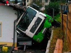 Beim Eintreffen an der Einsatzstelle wurde ein Lkw, seitlich auf einem Haus liegend, vorgefunden welcher von der L78 abgekommen ist und eine Holzwand durchbrochen hat. Der Lkw stürzte über eine Steinmauer und beschädigte beim Absturz das Hausdach sowie die Hauswand.