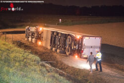 Er durchschlug die Leitschiene, stürzte über die Böschung und kam im Feld seitlich zu liegen. Wie durch ein Wunder blieb der 27 jährige Lenker unverletzt. Ein aufmerksamer Verkehrsteilnehmer, der auf der A1 in Richtung Wien unterwegs war, hatte den Unfall bemerkt und die Einsatzkräfte alarmiert. Die Aufräumarbeiten werden noch längere Zeit in Anspruch nehmen, da die Ladung, gefrorene Enten, händisch umgeladen werden müssen.