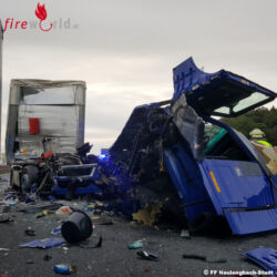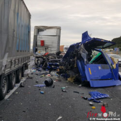 Am Unfallort war folgendes Lagebild festzustellen: Drei Sattelkraftfahrzeuge mit Auflieger waren kollidiert bzw. aufeinander aufgefahren, bei einer der drei Zugmaschinen wurde durch den Aufprall das Führerhaus abgerissen und kam schwer beschädigt am mittleren der drei Fahrspuren zu liegen. Die beiden Insassen hatten großes Glück und konnten das zerstörte Führerhaus mit leichten Verletzungen selbst verlassen. Die Lenker der beiden anderen Lkw war ebenfalls nur leicht