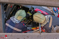 Kurze Zeit später traf auch das Kleinrüstfahrzeug der Freiwilligen Feuerwehr Heiligenkreuz mit drei Mitgliedern an der Einsatzstelle ein. Gemeinsam wurde mit der weiteren Erkundung und den ersten Befreiungsversuchen der Opfer begonnen.