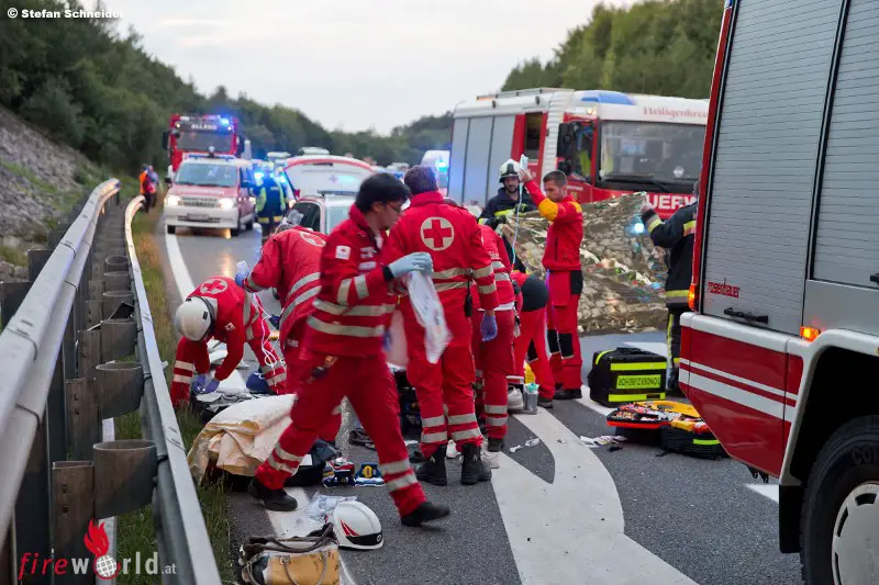 HEILIGENKREUZ (NÖ): Bei einem schweren Verkehrsunfall auf der Außenringautobahn (A21) Sonntagfrüh, dem 10. September 2017, kamen fünf Personen ums Leben und drei wurden verletzt. Ein mit acht Personen besetzter Kleinbus war gegen ca. 05:35 Uhr bei der Abfahrt Heiligenkreuz (Bezirk Baden) Richtungsfahrbahn Wien von der Fahrbahn abgekommen, touchierte eine Leitschiene und wurde in Folge gegen einen Brückenpfeiler geschleudert.