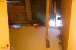 Die sich gerade zur monatlichen Zugsübung zusammengefundene Einsatzmannschaft konnte zwei Tanklöschfahrzeuge binnen Minuten besetzen und daher umgehend ausrücken. Am Einsatzort zeigte sich nach kurzer Erkundung, dass im Bereich eines Kamines der Dachstuhl aus noch ungeklärten Umständen Feuer gefangen hatte. Unverzüglich wurde die Räumung des Gebäudes und erste Löschmaßnahmen durchgeführt.