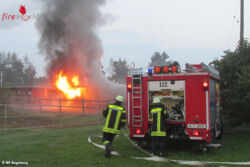 Aus ungeklärter Ursache geriet ein Unterstand für die Tiere in Brand, die Rauchsäule war bereits auf der Anfahrt weit sichtbar. Drei Trupps unter Atemschutz bekämpften den Brand, Tiere die sich im Gefahrenbereich aufhielten konnten vom Besitzer vorher auf eine angrenzende Weide in Sicherheit gebracht werden.