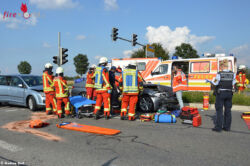 BRUCHSAL (DEUTSCHLAND): Zwei Schwer- und drei Leichtverletze forderte ein Verkehrsunfall am Samstagnachmittag, 23. September 2017, an der Einmündung der Christian-Pähr-Straße auf die B35. Die Feuerwehr musste mit schwerem hydraulischen Rettungsgerät eine schwerverletzte Beifahrerin schonend aus dem Unfallfahrzeug retten.