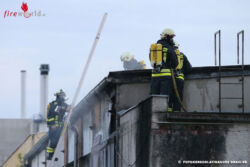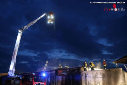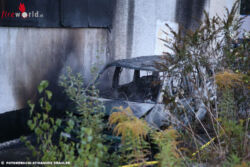 Aus bisher unbekannter Ursache kam es zu einem Pkw-Brand. Das Feuer griff rasch auf die angrenzende Lagerhalle über. Die Feuerwehr mussten das Dach aufschneiden, um an die Glutnester zu kommen und diese abzulöschen.