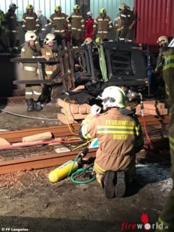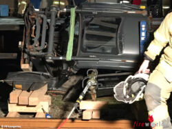 EBENSEE (OÖ): Am 25.09.2017 um 20:45 Uhr wurden die Feuerwehr Ebensee, Langwies und Roith zu einer Personenrettung alarmiert. Beim Eintreffen wurde ein Gabelstapler vorgefunden, der beim Verladen eines Eisenbahnwagons seitlich ca. 1,5m abstürzte.