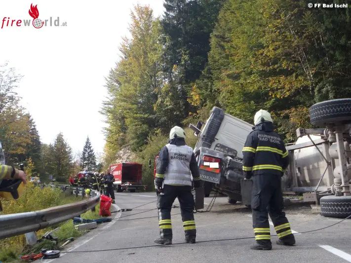 Ein Sattelaufleger, beladen mit Bruchmaterial, stürzte aus bisher unbekannter Ursache in einer Linkskurve um. Der Lenker wurde vom Roten Kreuz Bad Ischl ins Spital abtransportiert. Beim Eintreffen von „Rüstlösch Bad Ischl" war sofort erkennbar, dass die Einbauseilwinden des Rüstlöschfahrzeuges und des Schweren Rüstfahrzeuges für diesen Einsatz nicht ausreichen werden. Deshalb wurde die Freiwillige Pfandl nachalarmiert. Mittels Ölbindemittel konnte gerade noch verhindert werden, dass ausgetretenes Hydrauliköl ins Erdreich rinnen konnte.
