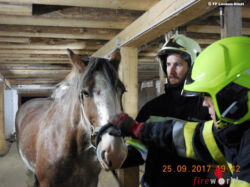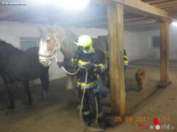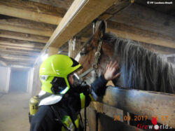 Der 1. Teil der Übung verlief relativ unspektakulär, der den Einsatzkräften bereits bekannte „Charly“ ließ sich geduldig von Allen ein mit einer Arbeitsleine gefertigtes Zaumzeug anlegen. Beim 2. Teil der Übung begab sich ein Atemschutzgeräte-Trupp in den Stall. Die Geräusche dieser Geräte waren für „Charly“ natürlich ungewohnt und seine Verunsicherung war dabei für alle spürbar und ersichtlich.