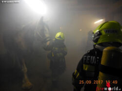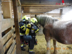 Einmal wurde der Stall mit einer Nebelmaschine nur „verraucht“ aber beleuchtet, im letzten Übungsteil wurde der Stall „verraucht“ und die Beleuchtung ausgeschaltet. Durch das behutsame Vorgehen der Rettungskräfte konnten sie Charly immer in kürzester Zeit beruhigen und ihn unversehrt aus dem Stall bringen.