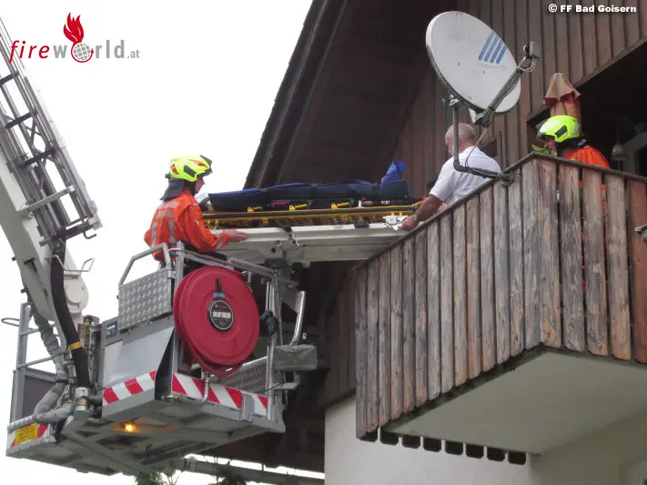 Aufgrund des Zustands und der Beengtheit des Stiegenhauses entschied die Notärztin, den Mann möglichst schonend aus seiner Wohnung zum Rettungsfahrzeug zu verbringen. Ein Transport über die Stiegen des Mehrparteienhauses in der Ortschaft Görb kam somit nicht in Frage, weshalb die FF Bad Goisern zu Hilfe gerufen wurde. Mittels Krankentrage wurde der Patient auf den Balkon im zweiten Obergeschoß verbracht, von wo aus er dann sanft mittels Hubsteiger zu Boden gehievt wurde. Dort übernahmen die Rettungsmannschaften wiederum den Mann, um ihn ins Krankenhaus zu fahren. Die FF Bad Goisern stand mit dem Kommandofahrzeug und Hubsteiger im Einsatz.