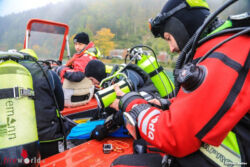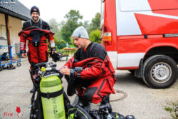 Zu einer feierlichen Übergabe kam es vor dem ersten Tauchgang im Beisein des Bereichsfeuerwehrkommandanten Oberbrandrat Erwin Grangl. Grund zur Freunde hatten die beiden frisch gebackenen Einsatztaucher, Brandmeister Robert Hubmann und Oberfeuerwehrmann Stefan Hubmann, als Ihnen Oberbrandrat Erwin Grangl, gemeinsam mit Brandinspektor Marvin Renner zwei persönliche Tauchgarnituren überreichte.