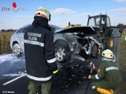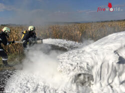 Das Feuer griff auf den Innenraum über. Die Einsatzkräfte starteten den Löschangriff mit dem Hochdruck- und einem Mittelschaumrohr unter Atemschutz, um ein Übergreifen auf das angrenzende Maisfeld zu verhindern und den Brand zu löschen. Nach dem Abtransport des Fahrzeuges reinigten sie noch die Fahrbahn. Insgesamt waren wir mit 17 Mitglieder über eine Stunde im Einsatz.
