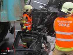 GRAZ (STMK): Um 09.30 Uhr des 3. Oktober 2017 wurde die Grazer Berufsfeuerwehr zu einem Verkehrsunfall mit einer eingeklemmten Person zum Verteilerkreis Webling alarmiert. Nach Ankunft der ersten Einsatzkräfte stellte sich heraus, dass ein Lkw auf der Abfahrt von der Autobahn auf einen anderen, stehenden Lkw aufgefahren war und sich der Fahrer nicht mehr selbstständig aus seinem Fahrzeug befreien konnte.