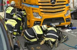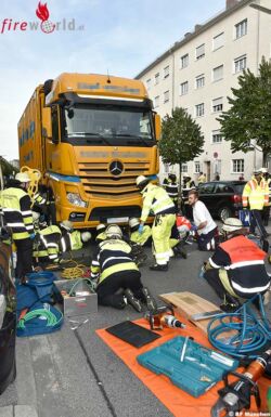 Als erste Entlastung, zersägten die Feuerwehrleute mit der Säbelsäge das Fahrrad in drei Teile und entfernten es. Anschließend hoben sie den tonnenschweren Lkw mit speziellen Lufthebern an und befreiten die Patientin schonend und achsengerecht. Die Besatzungen des Notarztwagen Mitte und des Rettungswagen der Malteser führten die medizinische Erstversorgung an der Einsatzstelle durch.