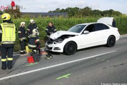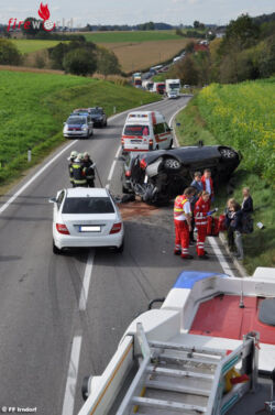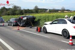 Auf bisher unbekannter Ursache krachte ein Pkw gegen ein vor dem Stauende anhaltendes Fahrzeug. Der vordere Pkw wurde durch die Kollision gegen ein weiteres Auto geschleudert und kam in Seitenlage auf dem vordersten Fahrzeug lehnend zum Stillstand. Die Unfallbeteiligten – darunter zwei kleine Kinder – wurden nach der Erstversorgung durch den Rettungsdienst ins Krankenhaus eingeliefert.