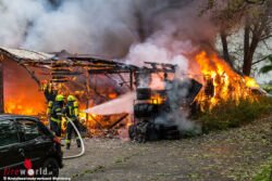 OLDENDORF (DEUTSCHLAJND): Gegen 08:00 Uhr des 4. Oktober 2017 wurden die Feuerwehren aus Oldendorf und Umgebung zu einem Großfeuer in die Straße Bekhof gerufen. In der Nähe eines Wohnhauses befindliche Lagerhallen, die als Autowerkstatt genutzt wurden, standen in Flammen.