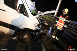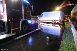 Ein Kleintransporter krachte gegen die Leitschiene und kam schwer beschädigt zwischen Pannenstreifen und rechtem Fahrstreifen zum Stillstand. Feuerwehr, Rettungsdienst und Polizei wurden zu dem Verkehrsunfall alarmiert. Glücklicherweise war niemand schwerer verletzt. Die Feuerwehr sicherte die Unfallstelle ab, unterstützte die Aufräumarbeiten und musste eine größere Menge ausgelaufener Betriebsmittel binden.