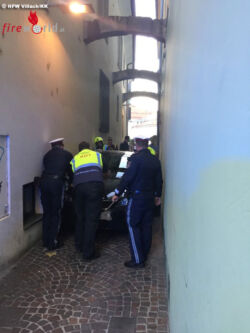 VILLACH (KTN): Kurz vor 18:00 Uhr des 12. Oktober 2017 forderte die Polizei die Hauptfeuerwache Villach zu einer außergewöhnlichen Pkw-Bergung in die Innenstadt an. Eine Dame steckte mit ihrem Fahrzeug in einer engen Gasse zwischen zwei Häusern in der Villacher Fußgängerzone fest.