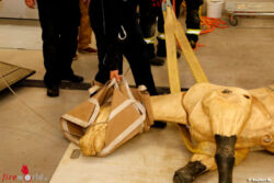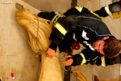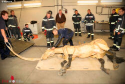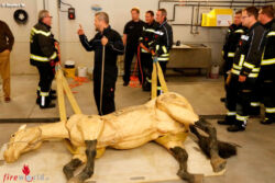 Gemeinsam mit den Ausbildnern der Animal Resuce Academy wurde das 200 kg schwere und lebensgroße Übungspferd aus dem Anhänger entladen. Im Anschluss trainierten die Feuerwehrmänner die Kopfsicherung des Tieres sowie bekamen verschiedene Techniken der Großtierrettung vorgestellt.