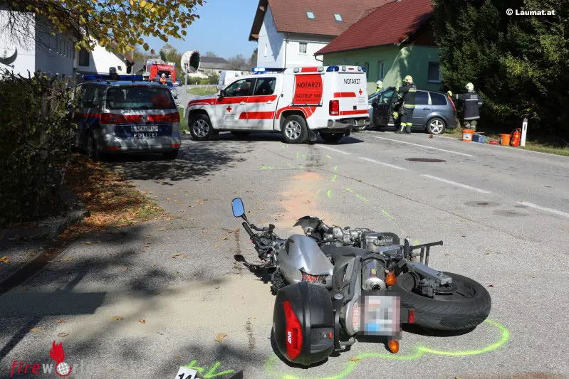 PETTENBACH (OÖ): Schwerste Verletzungen erlitt Samstagnachmittag, 14. Oktober 2017, ein Motorradlenker bei einer Kollision mit einem Auto in Pettenbach (Bezirk Kirchdorf an der Krems). Der Unfall ereignete sich auf der Kremsmünsterer- beziehungsweise Welser Straße.