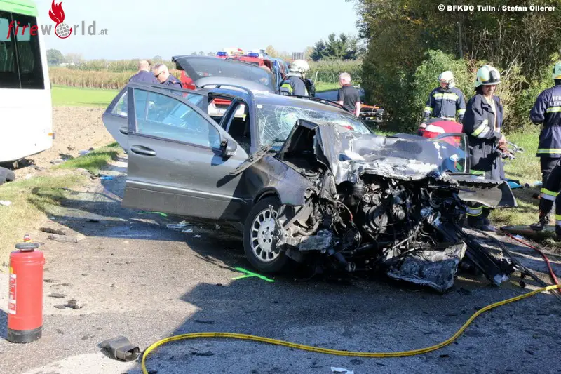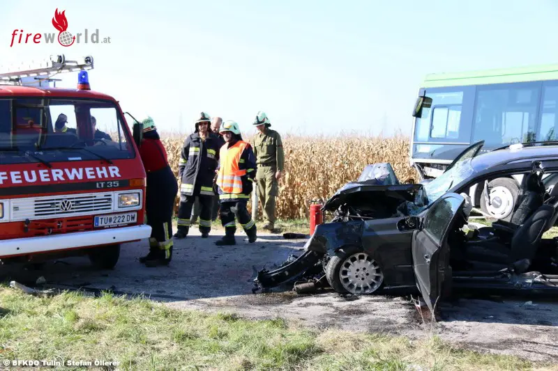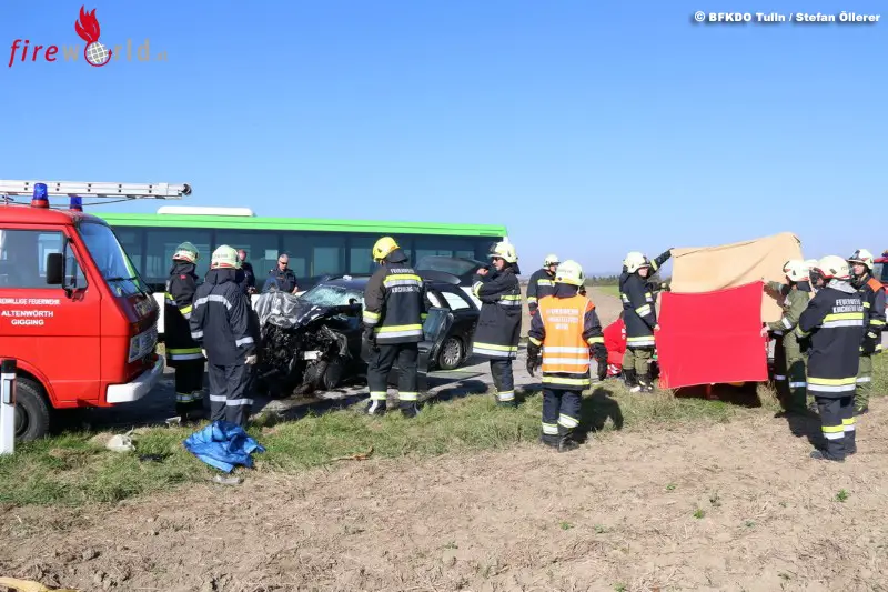 KIRCHBERG AM WAGRAM (NÖ): Zu einem schweren Verkehrsunfall kam es am Nachmittag des 16. Oktober 2017 bei Winkl (Gem. Kirchberg/Wagram, Bez. Tulln). Auf der Landestraße stießen ein Pkw Kombi und ein Linienbus zusammen.