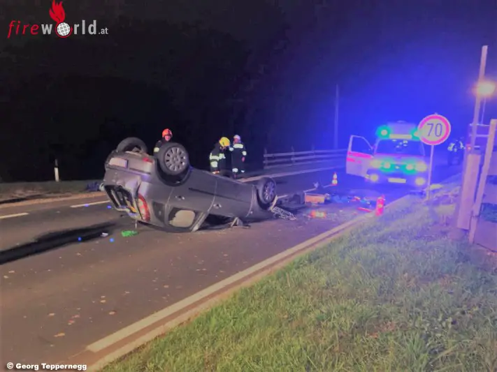 PREDING (STMK): Zu einem Verkehrsunfall wurden die Feuerwehr Preding am Abend des 14.10.2017 gerufen. Ein Pkw kam aus ungeklärter Ursache von der Fahrbahn, fuhr auf eine Böschung und einen Weidezaun auf. Danach wurde das Fahrzeug auf die Straße zurückgeschleudert und kam am Dach liegend zum Stillstand.