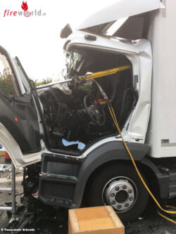 Ein LKW war mit hoher Wucht auf das Heck eines vorausfahrenden Gefahrguttransporters aufgefahren. Durch den Unfall wurde der LKW-Fahrer des auffahrenden Fahrzeuges hinter dem Lenkrad in seinem Fahrerhaus massiv eingeklemmt und konnte sich nicht aus seiner Zwangslage befreien.