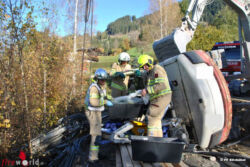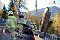 KITZBÜHEL (TIROL): Am Freitag, dem 20. Oktober 2017, um 09:45 Uhr wurde die Feuerwehr der Stadt Kitzbühel zu einem Baggerabsturz am Schwenterweg alarmiert. Ein 7,5 t – Bagger stürzte über eine Böschung um. Dabei wurde der Baggerfahrer in seiner Kabine eingeklemmt.