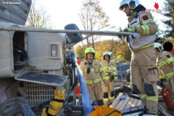 Nachdem der Bagger mit der Seilwinde des Schweren Rüstfahrzeuges gesichert wurde, konnte das Kabinendach mit der Bergeschere abgeschnitten und so ein Zugang zum Verunfallten geschaffen werden. Nach der ersten medizinischen Versorgung durch den Notarzt des C 4 wurde anschließend der verletzte Fahrer aus seiner NotlLage befreit und anschließend mit dem Notarzthubschrauber nach St. Johann geflogen.