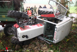 Großes Glück hatte dabei der Lenker, der sich selbständig aus dem Fahrzeug befreien konnte. Von der FF Winden-Windegg wurde gegen 12:45 Uhr die Feuerwehr Schwertberg zur Unterstützung alarmiert. Gemeinsam mit benachbarten Landwirten wurde der Anhänger vom Traktor gelöst und abtransportiert. In weiterer Folge wurde mithilfe der Einbauseilwinde des Schwertberger Rüstfahrzeuges der Traktor vom Baum weggezogen. Anschließend wurde der Traktor mit dem Greifzug gesichert und mit der Seilwinde aufgestellt. Gegen 15 Uhr konnte der Einsatz beendet werden.