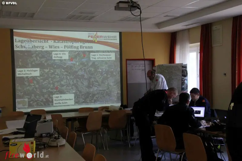 Ab 08.00 Uhr formierte sich der Bereichsführungsstab im Rüsthaus Wies, um von hier aus die Einsätze zu koordinieren. Die fiktive Lage waren schwere Unwetterereignisse in den Bereichen Schwanberg, Pölfing Brunn und Wies, die in den Tagen zuvor die örtlichen und umliegenden Feuerwehren stark forderten. Zur Verstärkung wurden am Morgen des 21.10.2017 die Katastrophenhilfsdienstzüge Nord und Mitte aus dem eigenen Bereichsfeuerwehrverband als Verstärkung bzw. Ablöse der eingesetzten Kräfte in Marsch gesetzt.