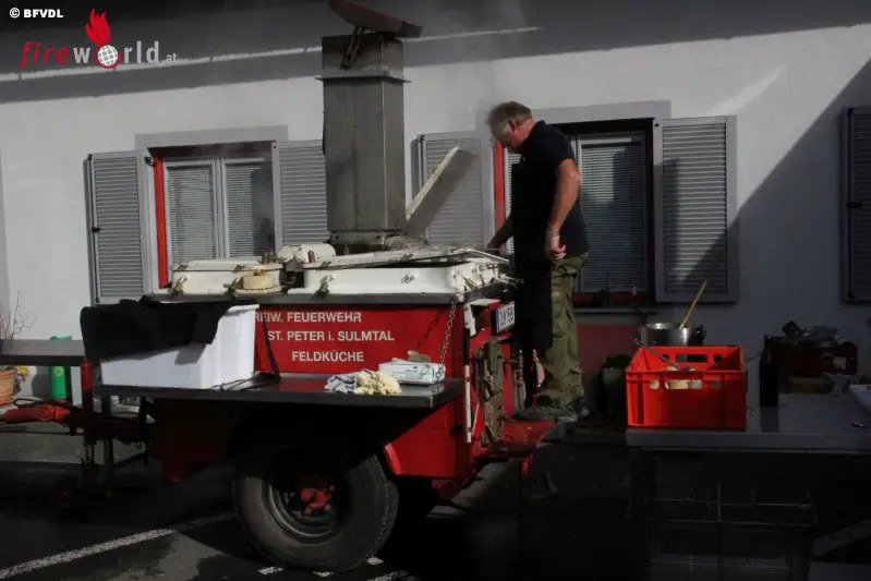 Für die Versorgung der Einsatzkräfte sorgte bereits ab den Morgenstunden in bewährter Weise die FF St. Peter im Sulmtal mit der Feldküche, somit ist die Feuerwehr im Ernstfall auch in diesem Bereich autark.