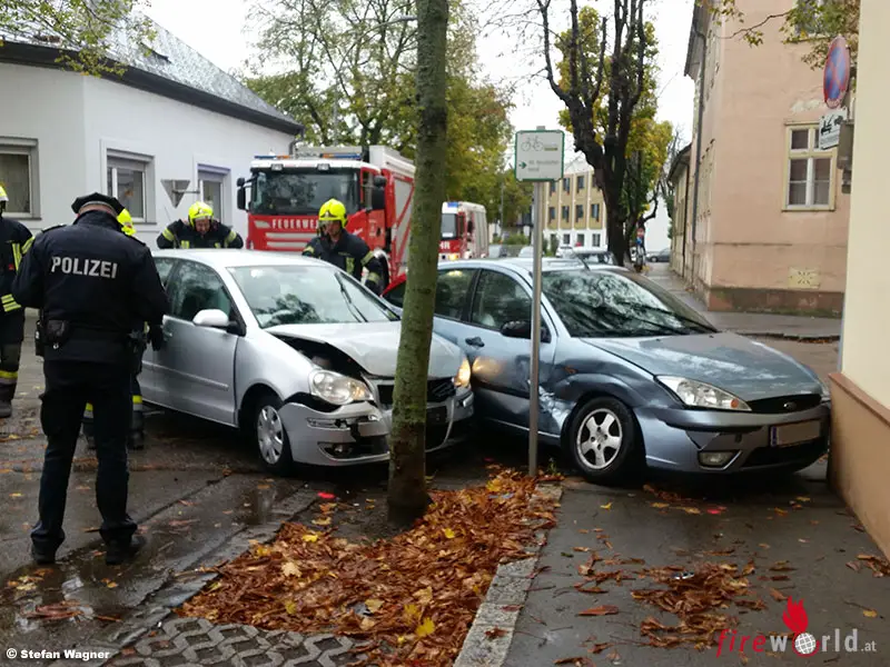 BADEN (NÖ): Am 23. Oktober 2017 wurden die Leesdorfer Feuerwehrmänner kurz nach 13 Uhr zu einem Verkehrsunfall in den Kreuzungsbereich Augustinergasse/Rathgasse gerufen. Aus noch ungeklärter Ursache kollidierten zwei Pkw und kamen am Gehsteig kurz vor der Hausecke zum Stehen.