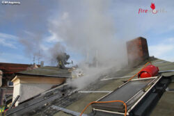 Das Wohnhaus war beim Eintreffen der Berufsfeuerwehr bereits geräumt. Sofort gingen mehrere Atemschutzgeräteträger über das Treppenhaus und das Baugerüst mit zwei C-Druckluftschläuchen zum Dachstuhlbrand vor. Beim Öffnen der Dachgeschosstür quoll dichter schwarzer Brandrauch. Es kam nach kürzester Zeit zu einer Rauchgasdurchzündung. Die Drehleiter kam zum Einsatz. 2 Gasflaschen wurden von der Feuerwehr in Sicherheit gebracht. Die Dachhaut musste geöffnet werden, um Glutnester zu löschen. Das Haus wurde mit einem Hochleistungslüfter entraucht. Keine Verletzten.