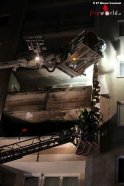 Die Freiwillige Feuerwehr Wiener Neustadt löste mit B3 die zweithöchste Alarmstufe aus. Der Balkon einer Wohnung im dritten Stock stand beim Eintreffen der ersten Fahrzeuge in Vollbrand. Die Exekutive war bereits damit beschäftigt, die Bewohner aus dem Mehrparteienwohnhaus zu bringen. Ein Atemschutztrupp begann unter Vornahme einer Löschleitung mit einem Innenangriff. In weiterer Folge wurde die Drehleiter in Stellung gebracht und eine Löschleitung für den Außenangriff und zum Schutz des vierten Stocks vorgenommen.