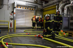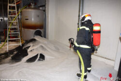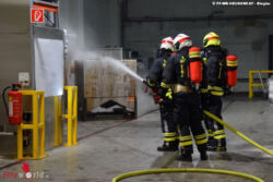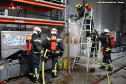 Erste Messungen mittels Wärmebildkamera bestätigten dies – an der Außenseite des Behälters konnten über 265 Grad Celsius gemessen werden. Aus diesem Grunde wurde die bereits hergestellte C-Löschleitung zur Kühlung des Behälters in Betrieb genommen, parallel dazu wurde der Rauch- und Wärmeabzug in der Halle ausgelöst sowie ein Hochleistungslüfter in Stellung gebracht.
